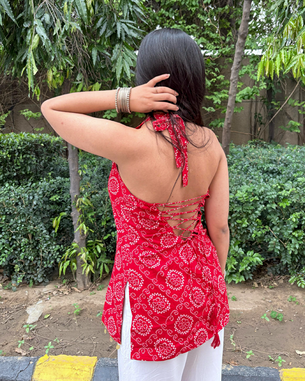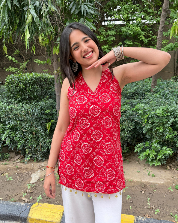 Red bandhani print short kurti