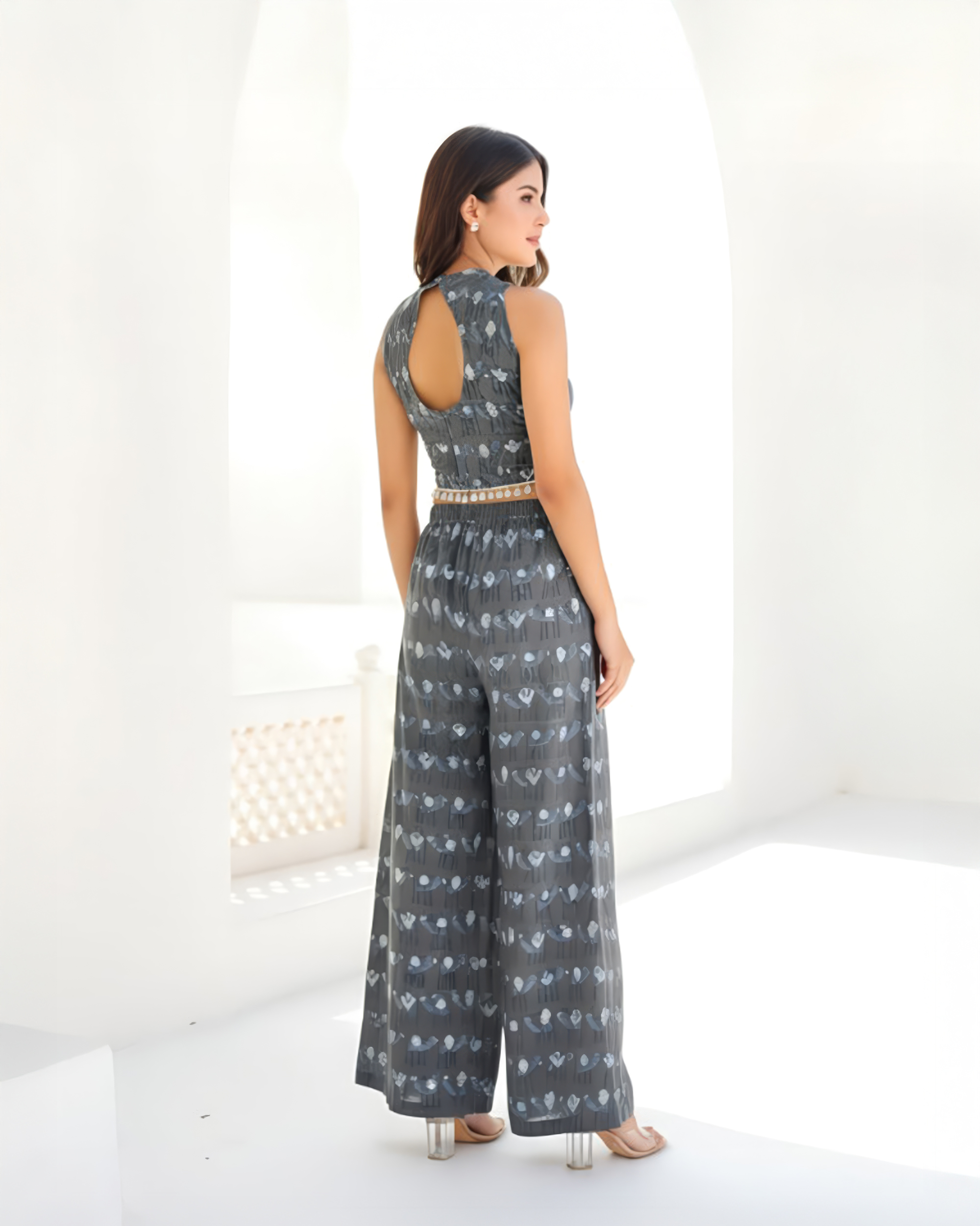 The Midnight Muse Co-ord Set is a celebration of minimal elegance and modern comfort. Crafted from 100% soft cotton, this grey printed co-ord set features subtle motifs and a clean, structured silhouette that keeps your style effortlessly chic from morning to night.